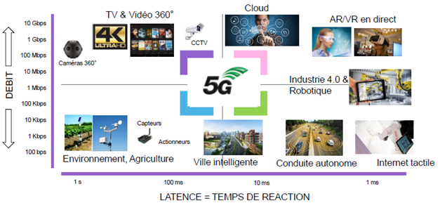 - l’ultra haut débit pouvant atteindre 10 gigabits par seconde sur de nombreux appareils simultanément. Ce débit assuré permettra une quasi-absence de rupture de communication, ce que la 4G et le WiFi ne peuvent assurer.