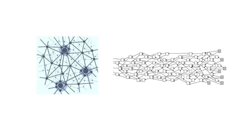 Organisation du réseau décentralisé selon le protocole Blockchain (à gauche) et Tangle (à droite)